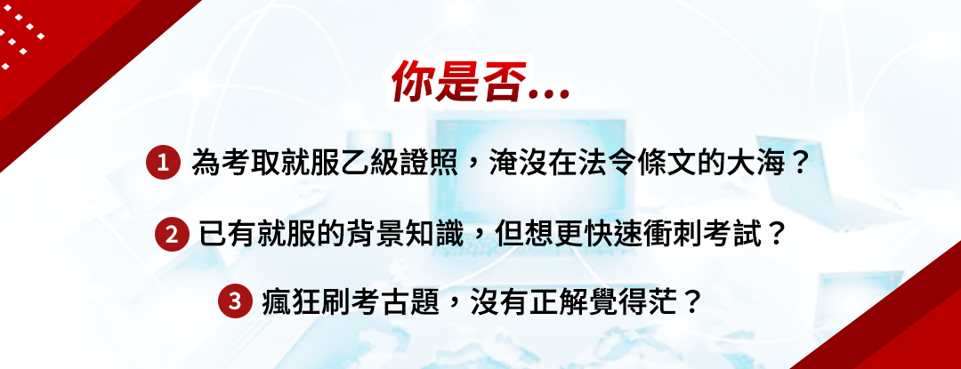 【就業服務乙級-衝刺攻略 On-line】以考古題解析的方式,快速抓住重點、複習法令,協助想跨入人資管理或就業服務領域的你,取得最搶手的國家級專業證照!