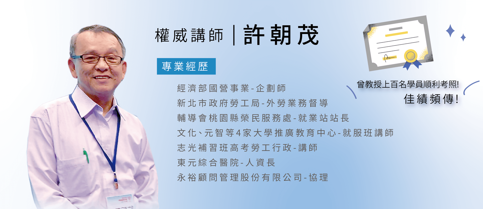 本套講義由知名就服講師 許朝茂 精心編寫,包含 「精修詳解法令30章」 與 「術科模擬試題」,幫助學員從基礎學習到考前衝刺,一次到位!