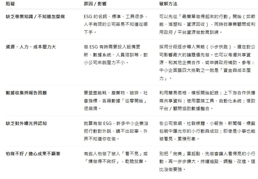 在長期與中小企業交流、也參考許多組織與研究後,我發現很多老闆或管理者在推 ESG 時,會卡在以下這些障礙,這些「痛點」都可以理解,也有「破解方式」: