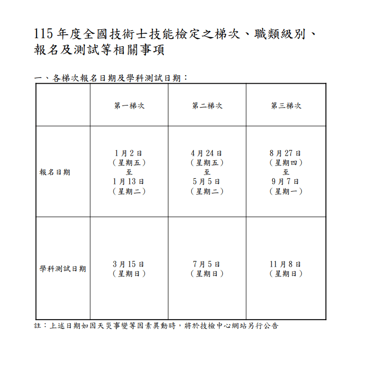115年度全國技術士技能檢定梯次 第一梯次:115年1月2日(五)至1月13日(二)