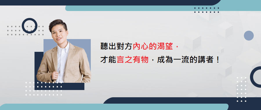 身為一個優秀的講者,你在開口說話前就必須了解自己話題的架構,所有篇幅都是為了核心問題與關鍵答案的鋪成,同時,聽見對方內心的渴望,你才能真正成為一名言之有物、一流的講者!